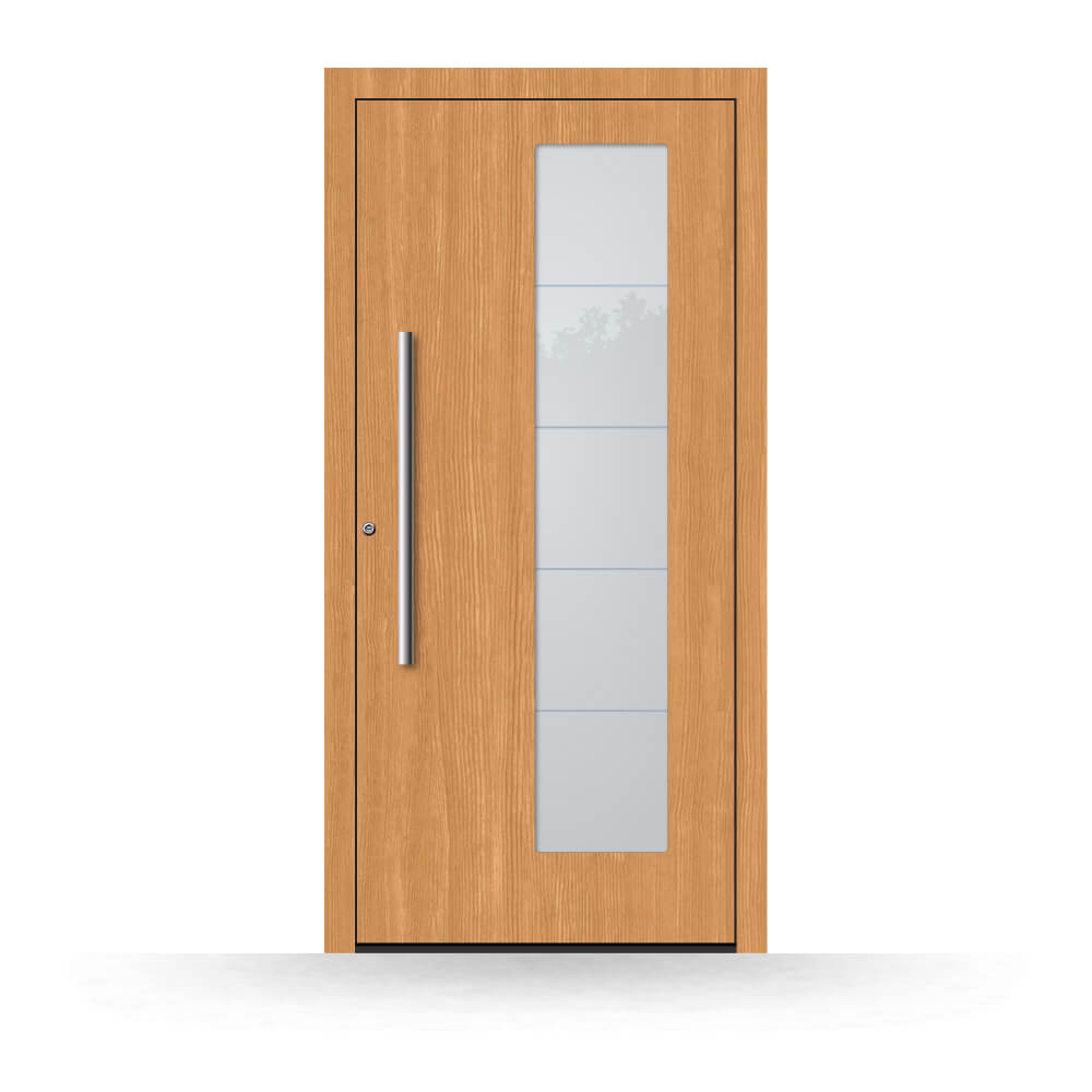 Ein Highlight in puncto Design setzt bei dieser Tür der großzügige, vertikale Glasausschnitt. Damit wirken die Holzhaustüren freundlich und einladend. Auch hier können Sie die Glasart selbst bestimmen.
