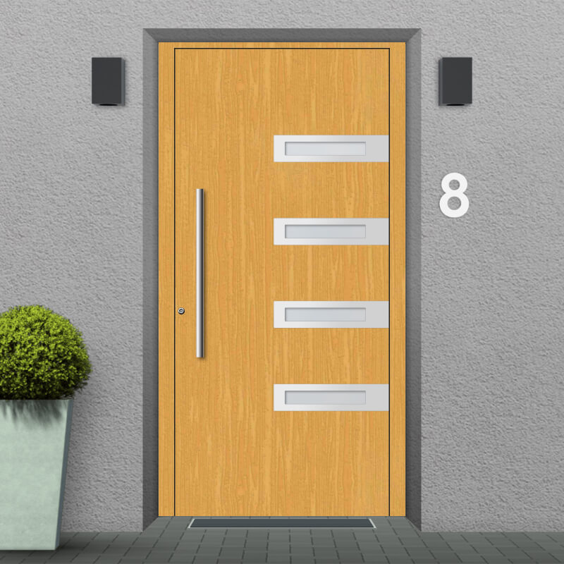 Die Haustür Neumünster spiegelt den Stil eleganter Moderne wider, ohne dabei zu ausgefallen futuristisch zu wirken. Sie besteht zu einem Großteil aus natürlichem Holz und wird nur durch wenige Akzente durchbrochen. Dazu gehören parallel untereinander gruppierte Glaselemente. Sie sind dezent gehalten und werden jeweils von einem Edelstahl-Feld eingefasst, das in der Breite etwa bis zur Mitte der Tür reicht. Gegenüber befindet sich der großzügige Türgriff, dessen Größe im Konfigurator angepasst warden kann.